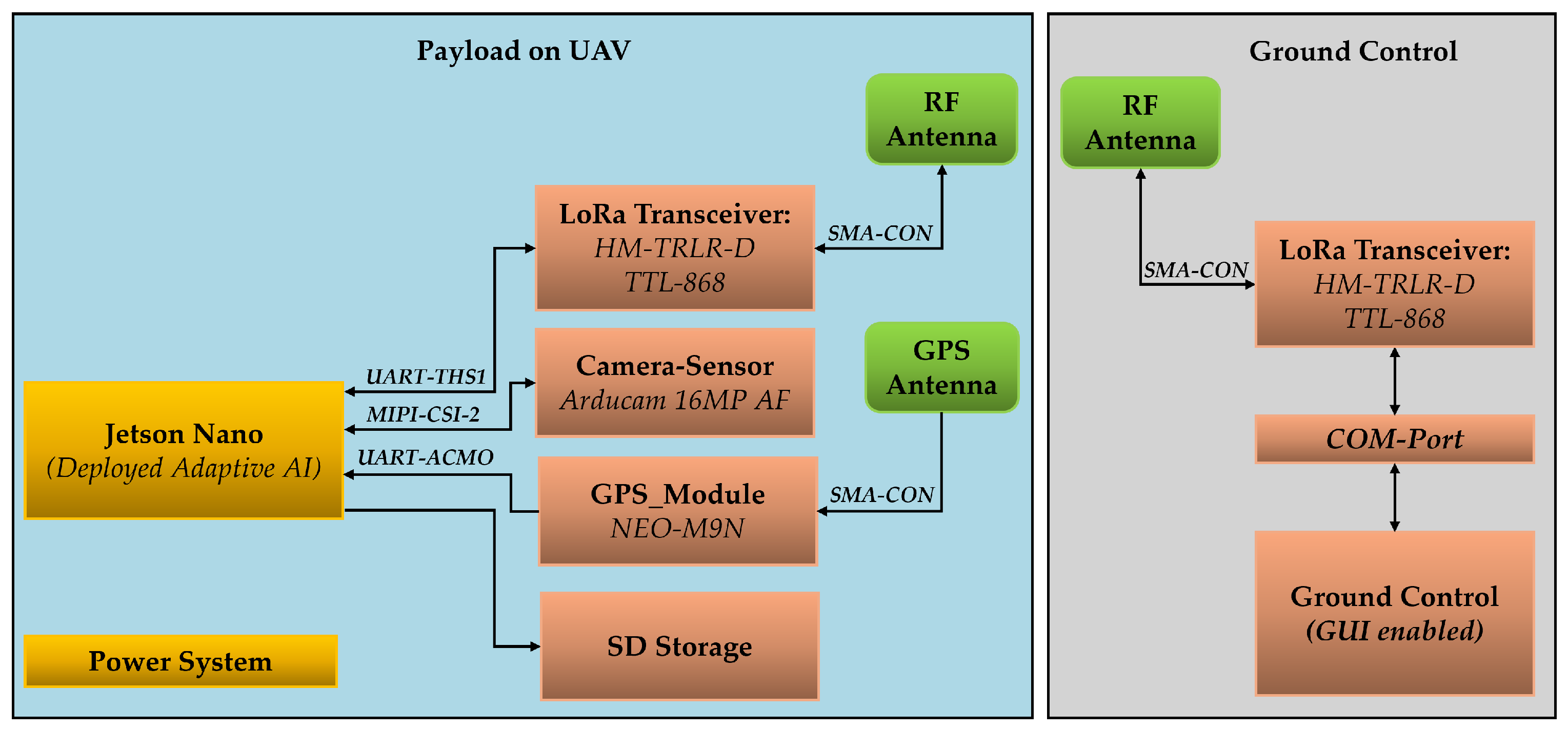 Our UAV configuration includes an Nvidia Jetson Nano, powered by an independent battery supply, and a radio transceiver module for remote communication with the ground control station. A schematic overview of the entire configuration is depicted in