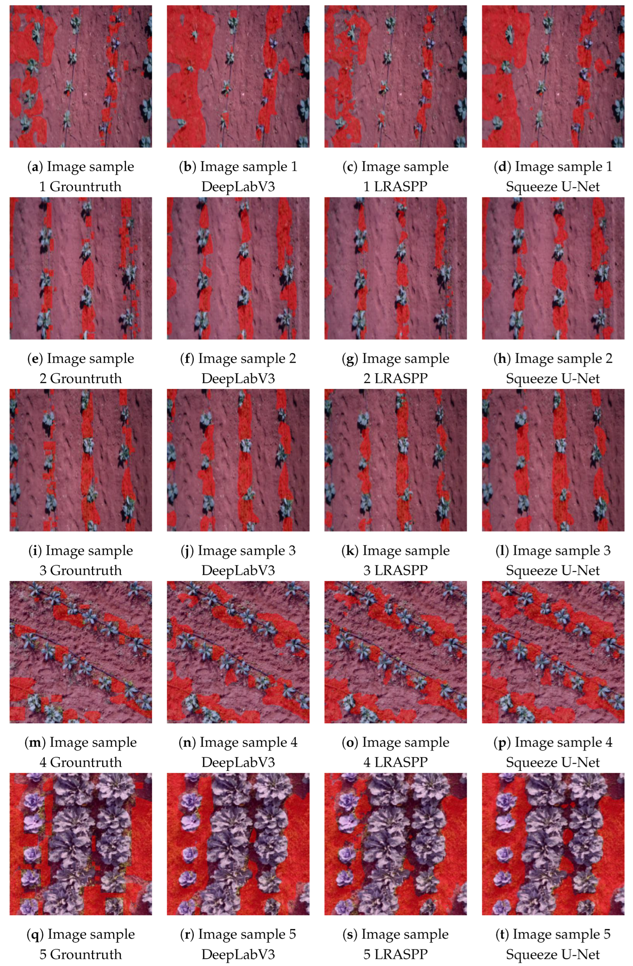 Figure 4 illustrates the manually annotated masks, where weeds are highlighted in red overlay and all other areas—including crop (salad) rows—are considered as background.