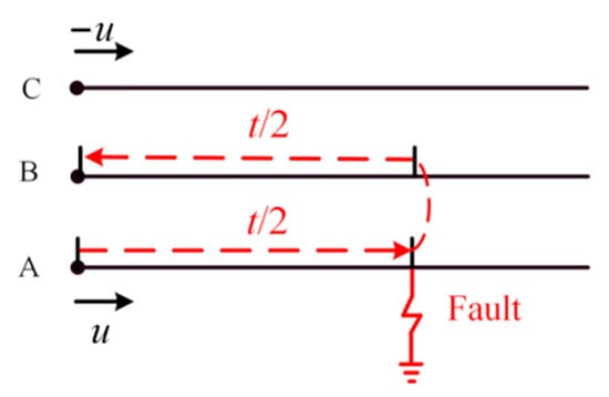 To analyze the wave transmission process in the faulty line, the pulse signal is injected offline into the line, with the reflected signal from the failure location heading for the origin through the non-injected phase [14].
