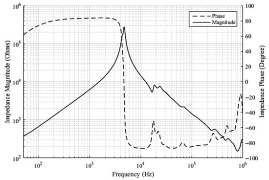 Distribution lines deliver power to customer loads via distribution transformers, which frequently exhibit phase unbalance. In fact, when the distribution transformer is under load, the high frequency signal creates a large voltage drop across the transformer leakage inductance, which is difficult to transfer to the low-voltage side through electromagnetic coupling. Since the leakage inductance present on the 10 kV side is high impedance at high frequencies, Figure 3 displays the high-voltage side’s impedance characteristics of the transformer reported in the literature under low-voltage-side short-circuit conditions. Even with a short circuit on the low-voltage (LV) side, the impedance on the high-voltage side remains substantially greater than the characteristic impedance of the line across most frequencies. Therefore, the traveling wave is approximated to be fully reflected on the high-voltage side [16]. Even if there is a slight asymmetry in the loads, the resulting aggregate impedance is still significantly higher than the line’s characteristic impedance, so the LV-side loads have a limited effect on the overall impedance characteristics.