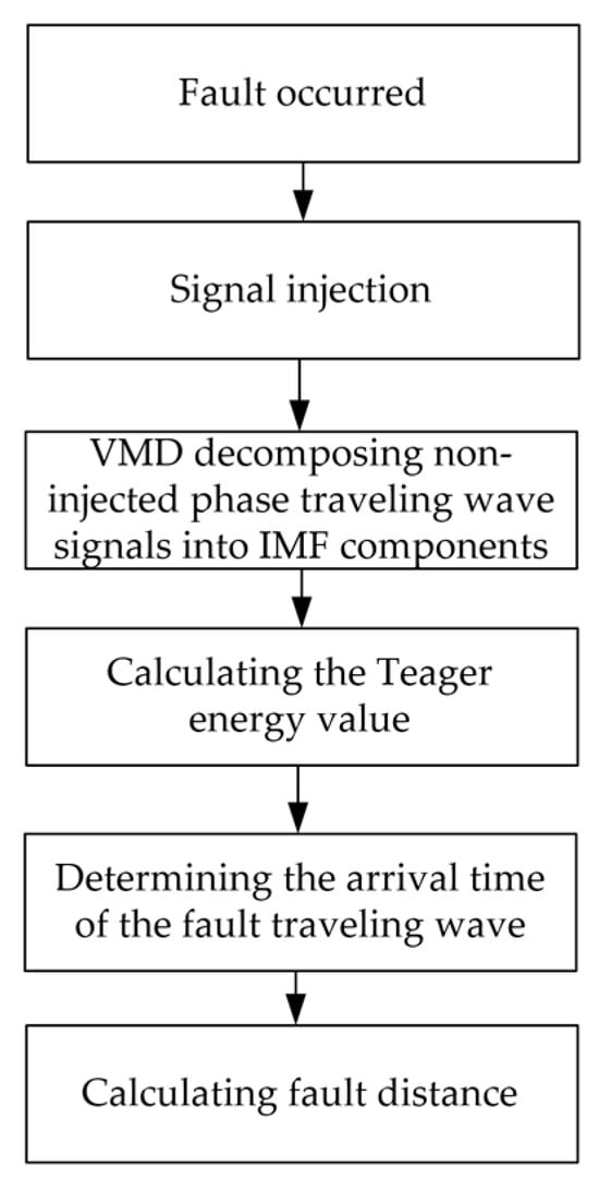 Following a fault incident, a pulse signal is introduced at the originating terminal of the system. The resulting traveling wave on the non-injected phase is captured at the same terminal. The collected signal is decomposed into k IMF components via Variational Mode Decomposition (VMD). The first IMF component is selected for Teager energy calculation. The time corresponding to the first major energy peak is identified as the arrival time of the fault-induced traveling wave. This arrival time, along with the known wave propagation velocity, is used to compute the fault distance, enabling precise line fault localization.