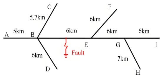 To evaluate the effectiveness of the proposed ranging principle in distribution networks, as well as to verify the influence of fault distance, fault resistance, noise, and pulse width on the ranging results, a complex distribution network is established in PSCAD 4.6 and Matlab R2023b for simulation tests. The injection point can be set to different locations, not limited to the substation outlet, so a representative topology is chosen as shown in Figure 5. Point A denotes the line origin, where the fault detection equipment is installed. The injection pulses had a width of 4 μs, an amplitude of 4 kV, and a signal sampling rate of 10 MHz. The conductor used was LGJ-240 with a diameter of 21.6 mm. A single-phase ground fault was applied to Phase A with a resistance of 100 Ω, located 9 km from point A.