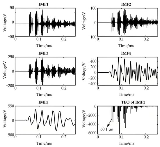 The Hilbert–Huang transform (HHT) is founded on the empirical mode decomposition (EMD) method to process the non-smooth original signals, and the change of the decomposed finite intrinsic mode function (IMF) depends on the signal itself, so the HHT has adaptability. Zhang Xiaoli et al. performed EMD decomposition of faulty traveling wave signals and Hilbert transformed the first IMF, and the first instantaneous frequency maximum of the IMF was taken as the wave-head arrival moment [12]. Based on EMD and Teager operator, Fan Xinqiao et al. used the first instantaneous energy maximum of EMD mode component as the traveling wave arrival time [13]. EMD decomposition can be applied in the identification and localization of different fault signals relative to wavelet analysis, but EMD decomposition will have the phenomenon of mode mixing, which leads to unsatisfactory decomposition and large ranging errors.
