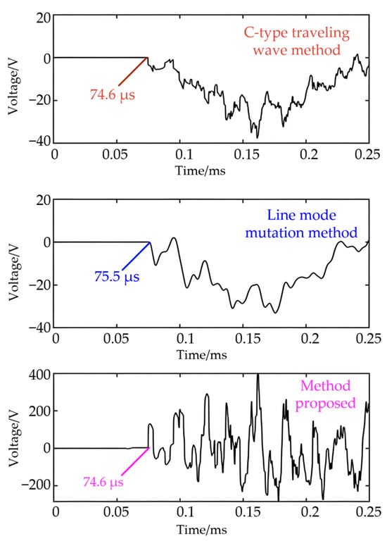 Figure 8 compares the traveling wave characteristics and arrival times determined by the C-type traveling wave method, the line-mode mutation method, and the proposed technique. The C-type method measured an arrival time of 60.1 μs—consistent with the proposed method—yielding a fault distance of 9.015 km, which matches the actual fault location. However, the proposed method produces a larger voltage amplitude and a steeper wavefront rise, enabling more accurate arrival time detection. The line-mode mutation method resulted in an arrival time of 60.7 μs, corresponding to a fault distance of 9.1 km, which deviates noticeably from the actual distance. This discrepancy arises because the line-mode velocity is used as an approximation for the zero-mode velocity, which is slower and more influenced by line parameters.