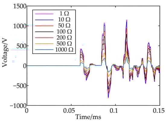 To investigate the influence of grounding resistance, this paper sets up fault resistors with different resistance values, and the grounding resistance is set to 1, 10, 50, 100, 200, 500 and 1000 Ω for simulation. The obtained non-injected phase waveforms are shown in Figure 10.