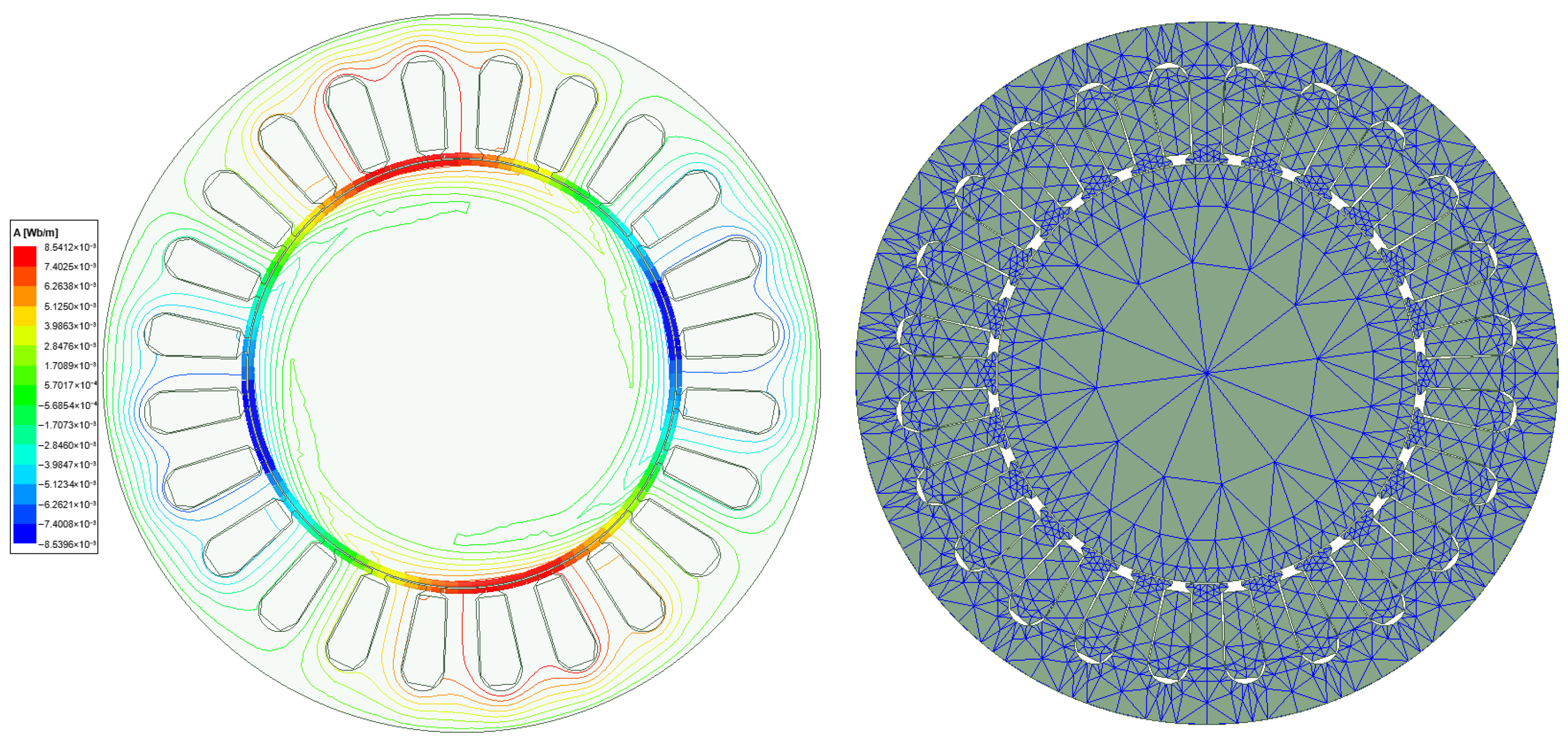 A finite element model was established in ANSYS Maxwell 2022 R1with automatic mesh generation. The final mesh for the motor cross-section comprised approximately 15,000 triangular elements. A key aspect of the meshing strategy was to ensure the accurate resolution of the eddy current distribution within the solid rotor. Given the high operating frequency (400 Hz), a significant skin effect is present. To adequately capture the rapid decay of electromagnetic fields within this depth, the mesh on the rotor surface was locally refined with three layers of elements. The thickness of the first layer was set to 2.5 mm, ensuring that multiple elements span the skin depth for high solution accuracy.
