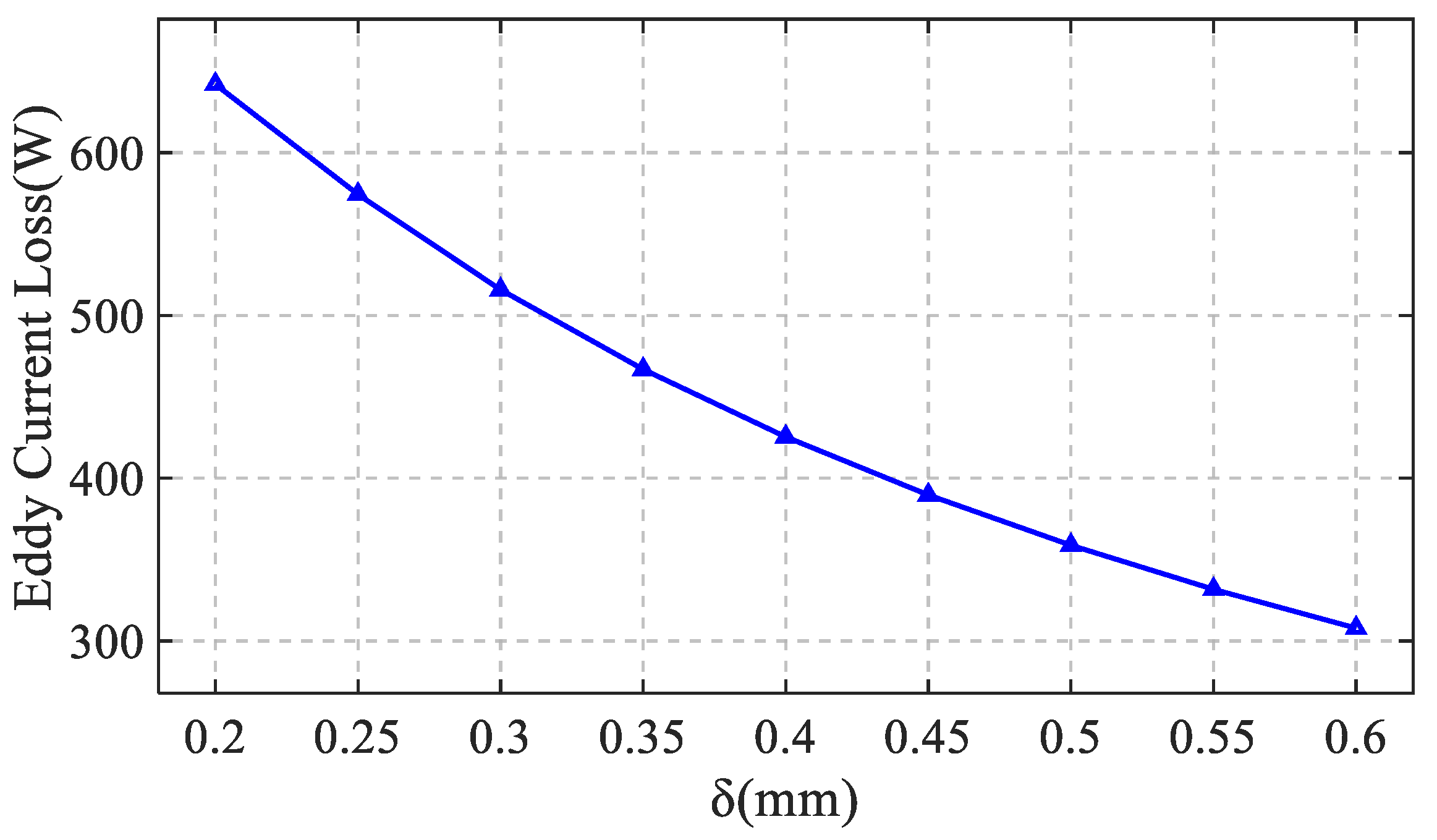 Figure 3, it presents the variation in the total rotor eddy current loss when the air gap length is changed. It can be seen from the figure that as the air gap length increases, the rotor eddy current loss decreases accordingly.