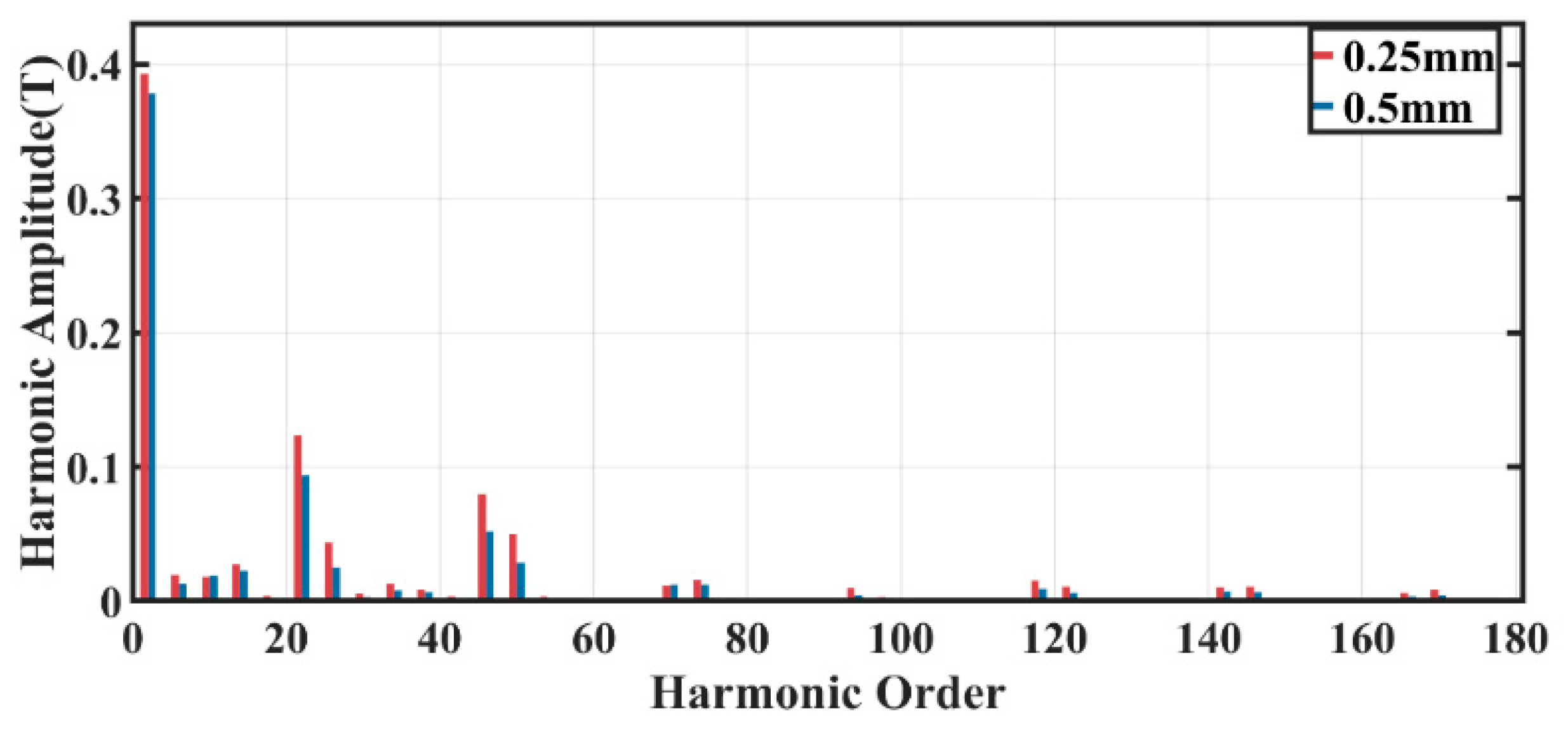 Figure 4, it presents the Fourier decomposition results of the radial magnetic density on the rotor surface when the air gap length is increased from 0.25 mm to 0.5 mm. The results show that when the air gap length increases, the air gap magnetic reluctance increases accordingly, the amplitude of each order of harmonics decreases, and the amplitude of high-order harmonics decreases more significantly.