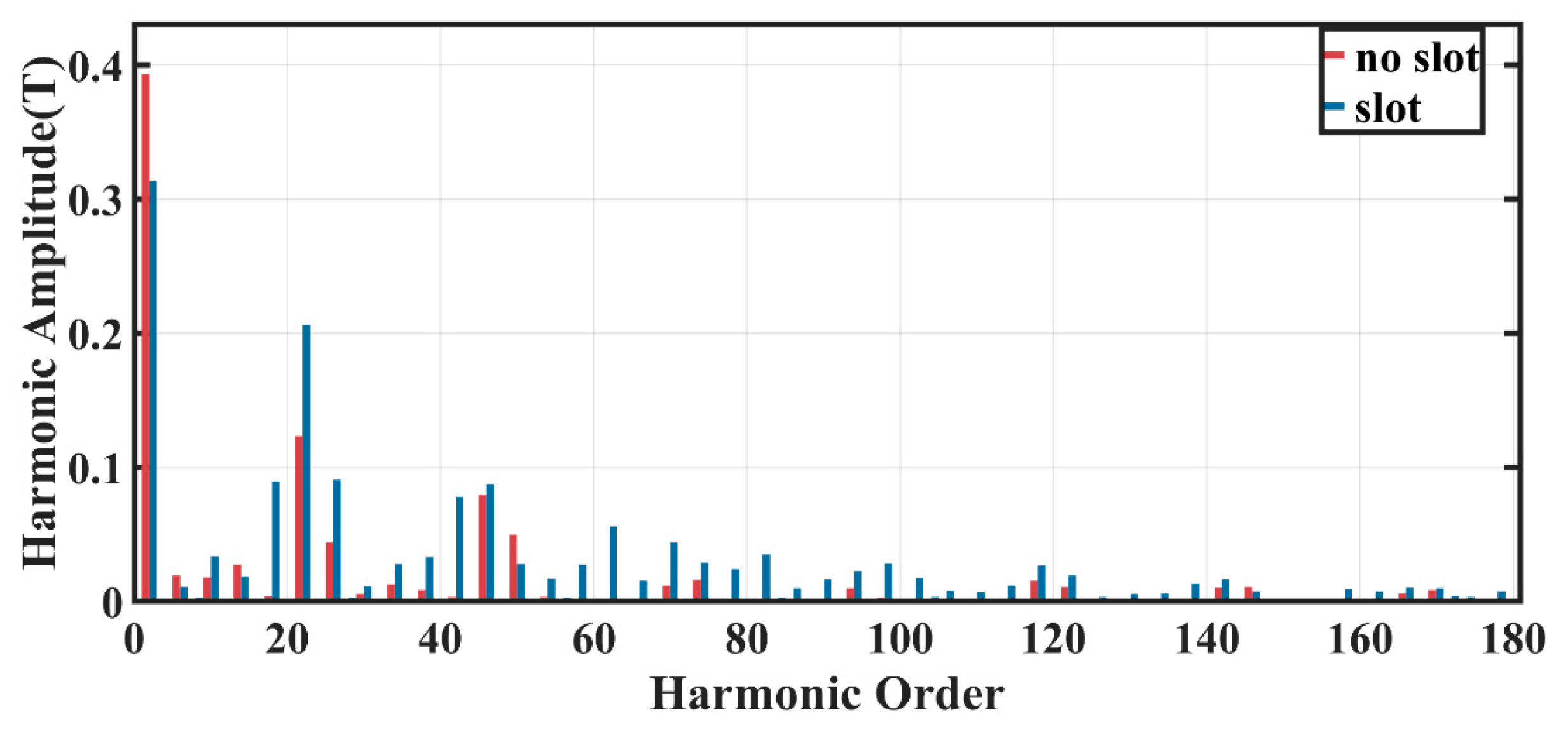 Figure 5, it presents the comparison between the FFT decomposition of the radial magnetic density on the rotor surface when the rotor slot width b = 1.5 mm, slot depth h = 12 mm, and number of slots