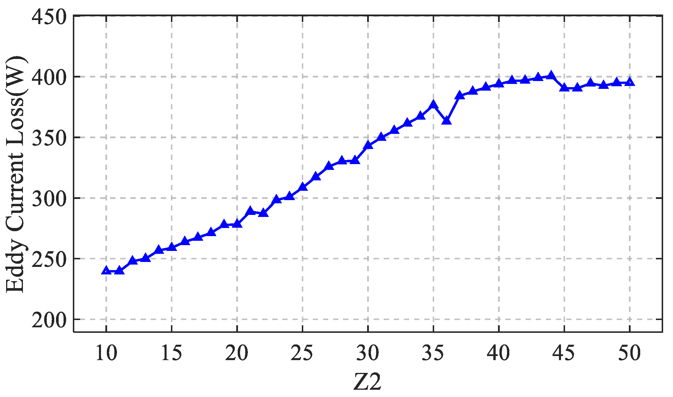 As the number of slots increases from 45 to 50, the effects of harmonic suppression and the increase in leakage reactance reach a balance, causing the loss to enter a plateau phase and remain essentially unchanged. Therefore, throughout the increase in rotor slot count from 10 to 50, the two main factors influencing eddy current loss are slot leakage reactance and harmonic suppression.