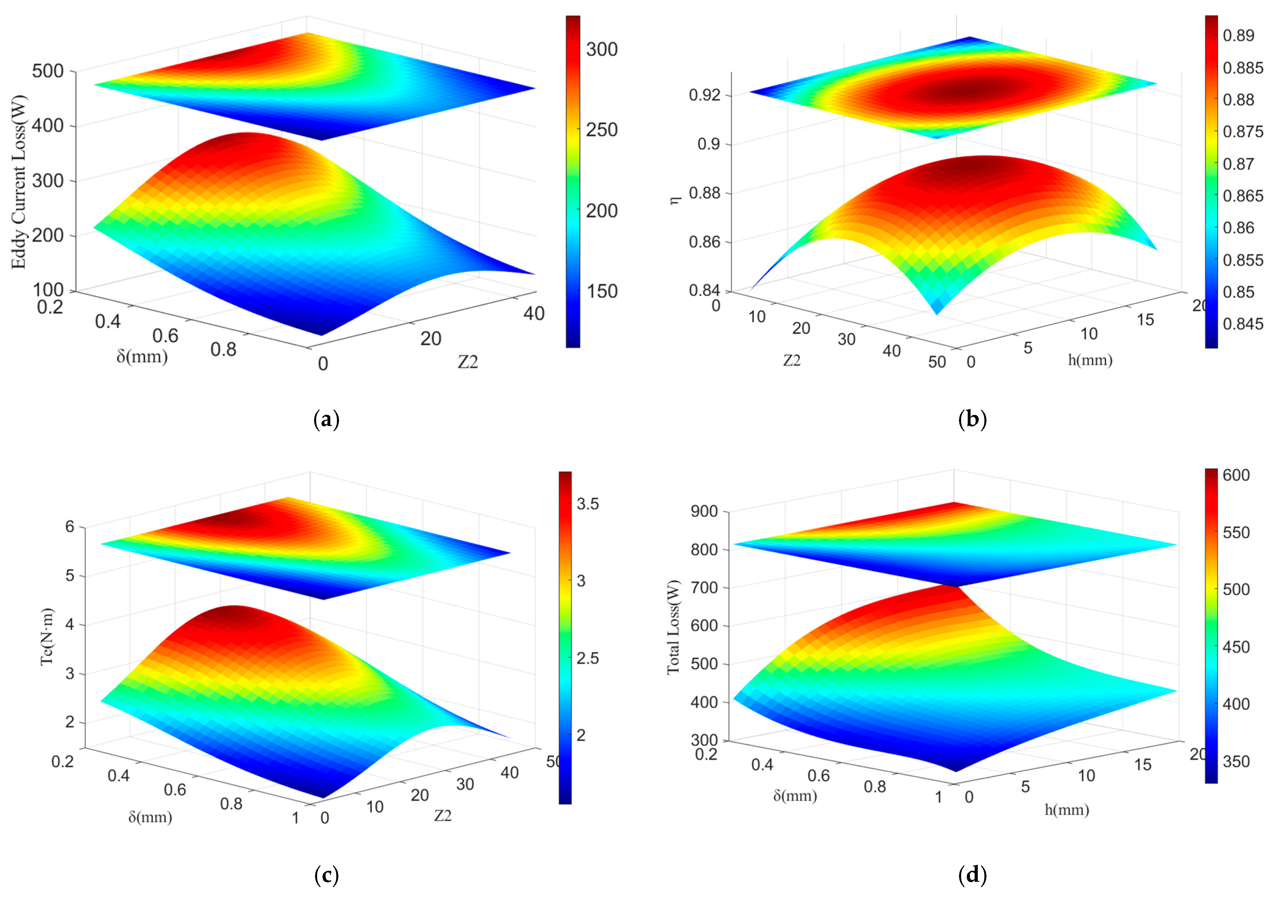 As can be seen from the above data, the number of rotor slots has the greatest impact on motor efficiency, while the air gap length has the most significant influence on eddy current loss and total loss. Regarding electromagnetic torque and output power, the air gap length and the number of rotor slots have a comparable impact on them. Since there are 6 possible pairwise combinations of variables and the amount of data results is too large to be fully presented, for each output result, the two variables with the greatest impact on it are selected, and the 3D surface plots are drawn as shown in