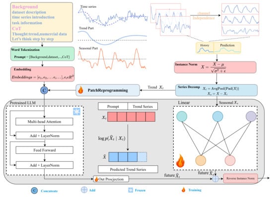 Matrix decomposition treats time series as a matrix and factorizes it into low-rank factors. The TSF models incorporating time series decomposition have achieved good results; for example, Prophet [29] with trend–seasonality decomposition and N-BEATS [30] with basis expansion and DeepGLO [31] with matrix decomposition. Recently, DLinear [32] has demonstrated exceptional performance by using a decomposition block and a single linear layer for each trend and seasonal component. With this idea, we apply a decomposition module to decompose time series into relatively smooth trend terms and fluctuated seasonal terms. We utilize linear modules to forecast future season patterns while leveraging the robust reasoning abilities of LLMs to analyze trend components.