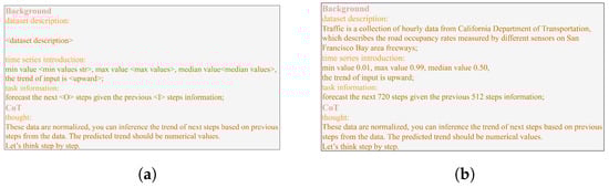As shown in Figure 2a, we construct the prompts using a structured, JSON-like template. The dataset description is automatically selected according to the specific dataset, and the task information is automatically determined by the lengths of the input and output sequences. The time series introduction is derived from the statistical characteristics of the sequence. In particular, given a time series , its monotonic trend is simply determined by computing the Mann–Kendall statistic S (Equations (7) and (8)) and checking whether the S is positive or negative, corresponding to an upward or downward trend, respectively. This is easier than calculating linear regression slope and does not assume a normal distribution of data.