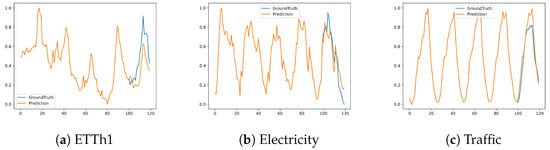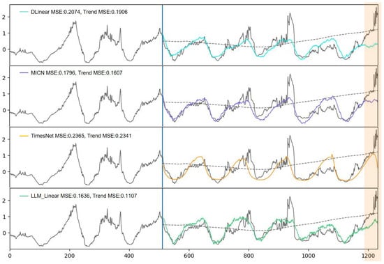 Figure 10 provides a qualitative result of the four different models by visualizing the prediction results for 720 steps in the Weather dataset. In the case of TimesNet, the error for trend prediction is high (MSE = 0.2341), leading to a higher overall prediction error (MSE = 0.2365). In particular, TimesNet predicts a downward ultimate trend (in the orange highlighted part), which is against the true upward trend.