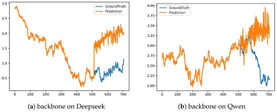 The performances of DeepSeek-Math-7B-RL and DeepSeek-Math-7B-Instruct are nearly identical, whether they are used as standalone LLM predictors or as the backbone within our framework. In contrast, Qwen2-0.5B-Instruct has a significantly different architecture from the DeepSeek-Math family. Nevertheless, all three LLM-only models are consistently outperformed by the full StreamTS framework. Figure 6 shows that both DeepSeek and Qwen models have a large deviation from the true value in the second half of the prediction. We conclude that just using a pre-trained LLM makes it difficult to make a good prediction for TSF tasks. Complex time series are often composed of multiple sub-sequences, and it is difficult for an LLM to make predictions of such complex sequences. For this reason, decomposing the time series into more smooth sequences will reduce the prediction difficulty of the LLM.