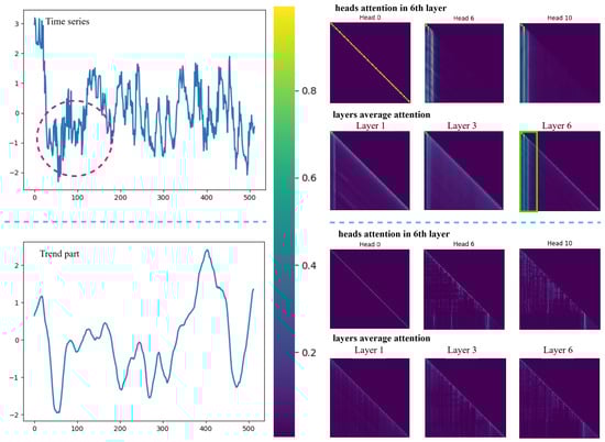 The left side of Figure 7 displays the original sequence and its decomposed trend component from top to bottom, while the right side shows the corresponding attention distribution maps generated in the 1st, 3rd, and 6th layers and the multiple heads (0, 6, and 10) for the 6th layer. We can observe dramatic changes in the original sequence (highlighted by a red circle in Figure 7), and these change are reflected in the attention maps, more intensively in the 6th layer (highlighted by a green box in Figure 7). Meanwhile, the trend sequence is smooth owing to a moving average operation. The corresponding attention maps show the trend well eliminates the influence of local noise.