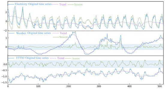 Time series decomposition and its effects. In Figure 8, we visualize the results of time series decomposition for three datasets. The Electricity dataset features short and relatively regular change cycles, the Weather dataset shows periodicity on larger timescales, while the ETTh1 dataset lacks clear patterns of change. After decomposition of the complex time series into trend and seasonal components, the LLM is used for long-term trend prediction, and the linear model is used for local seasonal fitting. The time series in the Electricity dataset exhibits inherent regularity, thus the decomposed seasonal series is more consistent in magnitude compared to the original series. The time series in the Weather dataset contains several cyclic peaks. After decomposition, the periodic is well captured by the trend, and the remaining seasonal series are reduced to a small range, which minimizes their interference in the prediction process. The decomposition of the time series of the ETTh1 dataset also produces a seasonal series within a small range around zero, which is better predicted by considering short-term influence.