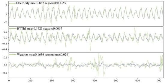 We demonstrate the linear model fits the seasonal series well in Figure 9. For the Electricity dataset, the linear model can accurately capture the waveforms, leading to a small MSE 0.1355 for the seasonal part. For the Weather and ETTh1 datasets, while there are some points where the linear model does not fit perfectly, it learns data patterns rather than overly responding to outliers. According to [19], simple linear layers have exceeded a complex self-attention mechanism for learning time dependency. This can be explained by the fact that time series variations can be highly influenced by the sequence order, while the attention mechanisms are permutation invariant on the temporal dimension.