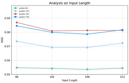 Impact of input length. Figure 11 shows the model performance of predicting the future steps of 96, 192, 336, and 720 on the ETTh1 dataset when the input lengths are 96, 192, 336, and 512, respectively. We can see that the error of the prediction decreases with the input length up to 336, but at that point, the prediction error starts to increase with further increase of the input length. This indicates the input step length in a certain range will bring more auxiliary information to the prediction, but too much data will bring interference to the prediction of the model. Based on these findings, we conclude that excessively long history input lengths do not enhance prediction accuracy and may, in fact, increase computational overhead. Thus, identifying an optimal history length is essential for effective model performance.