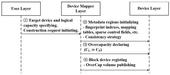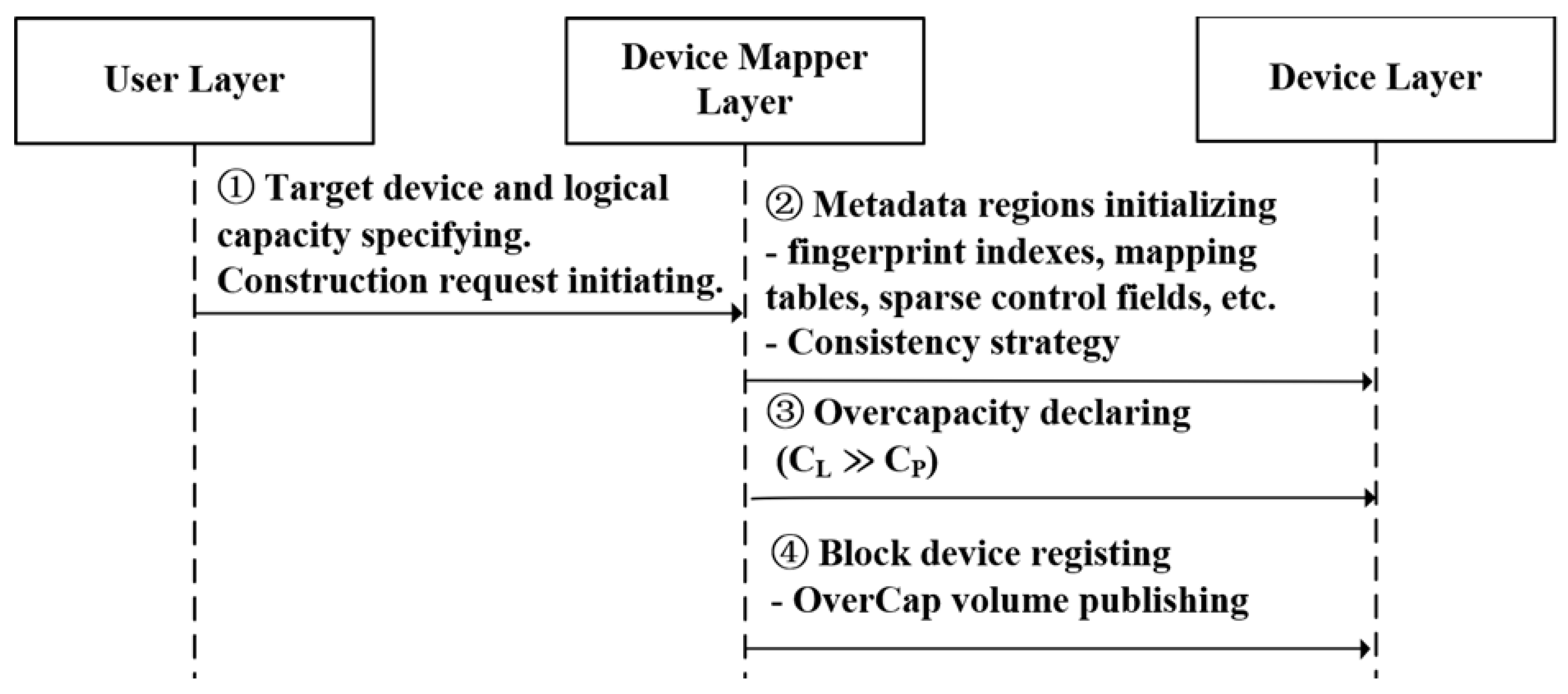 - The Device Mapper target module initializes the metadata structures required for OverCap volume management on the specified physical storage device. These metadata components comprise the fingerprint index, logical-to-physical mapping table, and sparse control segments. In addition, it registers mechanisms supporting metadata crash recovery and consistency-aware write strategies.