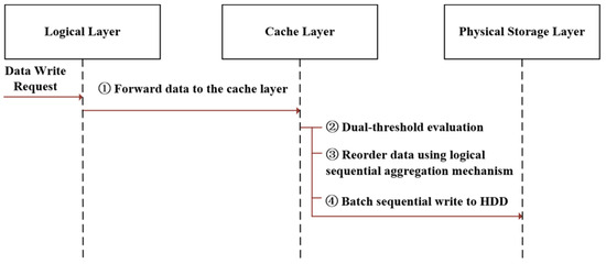 - Write Request Buffering: Upon receiving write requests from the upper layer, logical layer buffers the data in a high-performance SSD cache instead of writing immediately to the backend disk. This cache functions as the write entry point, temporarily storing incoming write data to support low-latency response and enable batch scheduling.