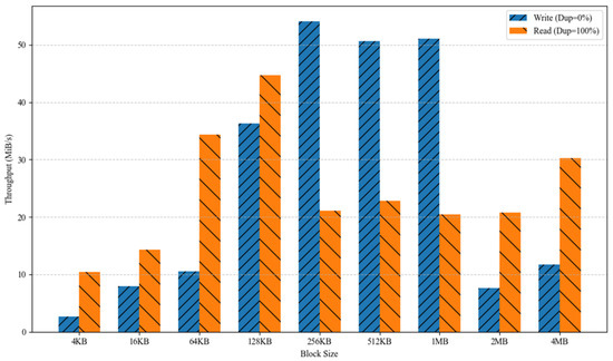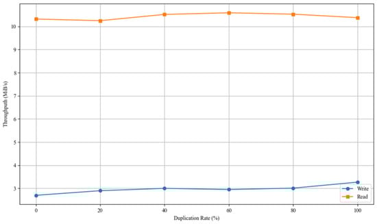 An experiment was designed to evaluate the impact of data duplication ratio on the read and write performance of the baseline scenario. Under fixed conditions of a 4 KB block size and 32 concurrent threads, the duplication ratio was incrementally varied, and the corresponding changes in bandwidth were measured. The experimental results are presented in Figure 7.