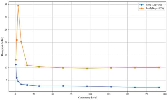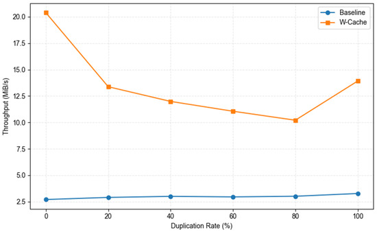 Furthermore, although the write performance test was conducted with a default duplication rate of 0%, we also evaluated performance under scenarios with varying levels of duplicate data. The experimental results, presented in Figure 10, indicate that, with 32 concurrent threads and a fixed block size of 4 KB, the write bandwidth of the W-Cache solution decreases from 20.6 MiB/s to 10.3 MiB/s as the duplication rate increases from 0% to 80%, exhibiting a pronounced downward trend. This phenomenon suggests that, as the proportion of duplicate data increases, the benefits of cache write merging are progressively offset by the additional overhead of fingerprint calculation, duplication detection, and metadata maintenance. However, when the duplication rate reaches 100%, nearly all writes bypass the disk due to deduplication hits, which simplifies the system write path and causes the bandwidth to recover to 13.8 MiB/s, forming a typical “V-shaped” fluctuation pattern. In contrast, the baseline system, due to its inherently lower write performance and absence of a cache absorption mechanism, consistently maintains a bandwidth of 2.6–2.9 MiB/s across all duplication rates, rendering it virtually insensitive to changes in duplicate data.