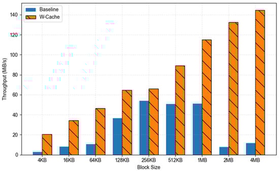 We first compared the write throughput of W-Cache and baseline using 32 concurrent threads across a range of data block sizes. The corresponding results are illustrated in Figure 8. W-Cache consistently outperformed baseline across all block sizes, indicating consistent and efficient write acceleration. In small-block write scenarios (4 KB–64 KB), the baseline exhibited limited throughput as each individual write unit required full deduplication processing. This process involved frequent fingerprint calculations, index lookups, and metadata updates, thereby significantly constraining overall OverCap volume throughput. In contrast, W-Cache leveraged an aggregation mechanism to merge scattered writes into sequential batches, which significantly reduced the frequency of metadata processing and I/O scheduling overhead. This approach yielded a bandwidth improvement of up to 6.4×, highlighting its superior optimization for small-scale I/O workloads. In medium-block write scenarios (128 KB–1 MB), baseline performance plateaued, while W-Cache demonstrated continued performance improvements, with speedup factors ranging from 1.7× to 2.3×. This finding indicates that the cache aggregation mechanism continued to effectively reduce redundant overhead and enhance throughput for medium-granularity writes. In large-block write scenarios (2 MB–4 MB), the baseline throughput declined significantly, while W-Cache exhibited greater adaptability, sustaining steady bandwidth improvements with a consistent speedup of more than 3.5×. This performance enhancement was attributed not only to the optimization of the request scheduling mechanism enabled by the caching strategy but also to the inherent advantage of SSDs in handling large sequential writes. The aggregated write requests generated by W-Cache were more likely to trigger page alignment and internal buffering mechanisms in the underlying SSDs, thereby reducing write amplification and alleviating concurrency-induced jitter.