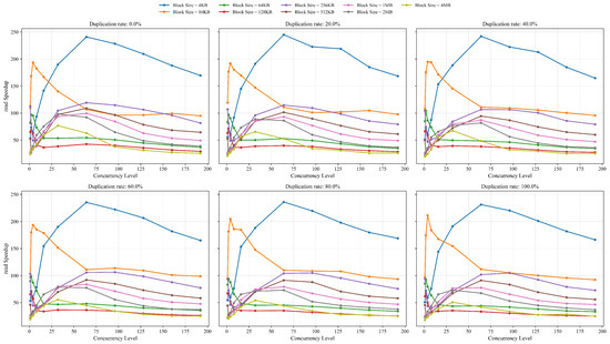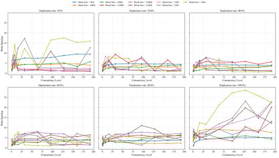 Specifically, when the data block size was in the small-block range (4 KB, 16 KB, and 64 KB), the speedup curves exhibited minimal fluctuation irrespective of the duplication rate. For example, in the subfigures corresponding to duplication rates of 0% and 20%, the acceleration ratios for small-block writes were mostly clustered within the 2×–5× range, with no significant fluctuations across different concurrency levels. This behavior demonstrates the stability of W-Cache’s aggregation mechanism under fine-grained I/O workloads, where its performance advantage remains relatively consistent. These results indicate that W-Cache substantially mitigates metadata update frequency and scheduling overhead associated with high-frequency small-block writes. However, the achievable acceleration remains limited by the inherent constraints in write aggregation granularity and the upper bound of caching benefits.