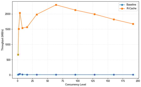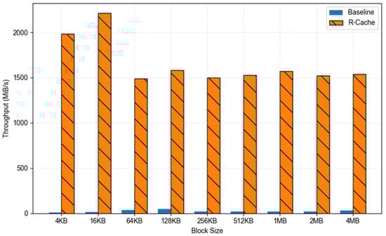 First, we compared the read throughput of R-Cache and baseline using a fixed concurrency of 32 threads across different block sizes. As shown in Figure 12, R-Cache consistently outperformed baseline across the entire block size range, with especially significant gains in small-block scenarios. In the 4 KB–64 KB range, baseline suffered from frequent block accesses and L2P mapping lookups, with each request traversing the I/O stack and accessing backend devices, leading to persistently low throughput. In contrast, R-Cache cached hotspot data on the SSD after the initial access, allowing subsequent hits to bypass the backend read path and significantly increase throughput, thus demonstrating its efficacy in managing random hotspot read workloads. As the block size increased (128 KB–1 MB), both configurations experienced throughput improvements. R-Cache continued to benefit from sustained cache hits with high-speed access, maintaining throughput above 1500 MiB/s and demonstrating robust adaptability to medium-sized requests. In large-block sequential reads (2 MB–4 MB), although baseline performance improved due to the sequential nature of access, the performance differential narrowed slightly. Nonetheless, R-Cache continued to provide a substantial performance advantage.