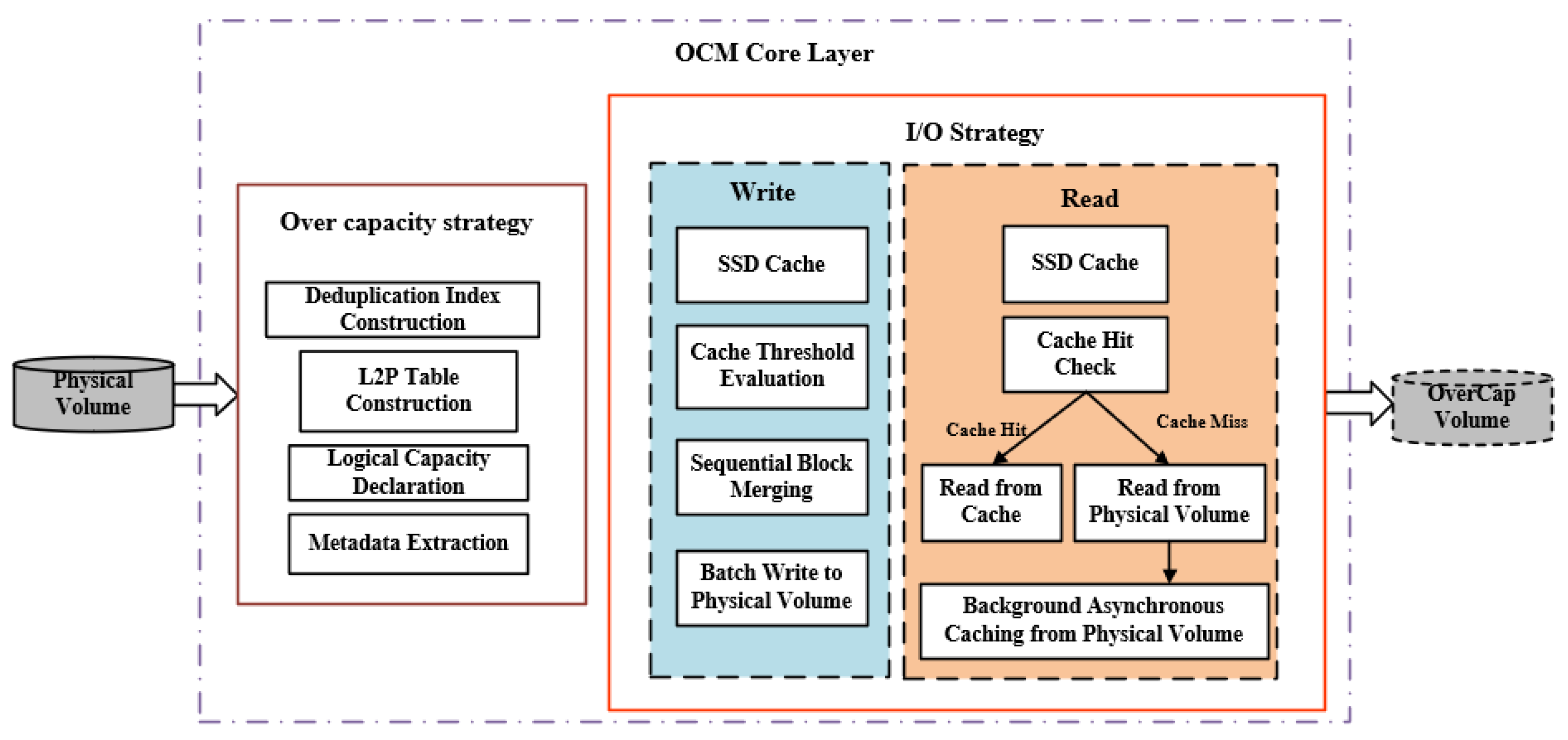 - A hierarchical asynchronous I/O optimization strategy based on SSD caching. After completing the initial construction of the OverCap volume, OCM employs a hierarchical I/O optimization strategy based on SSD caching. In the write path, the cache strategy leverages an SSD-based layer to temporarily absorb write requests from upper-layer components. When the cache reaches a predefined threshold, the strategy merges the buffered data into sequential blocks and performs asynchronous batch writes to the physical volume. In the read path, the strategy first evaluates cache hits within the SSD cache layer. If a cache hit occurs, the requested data is returned immediately; otherwise, the strategy accesses the underlying HDD-based physical storage and initiates asynchronous background caching of the retrieved data.