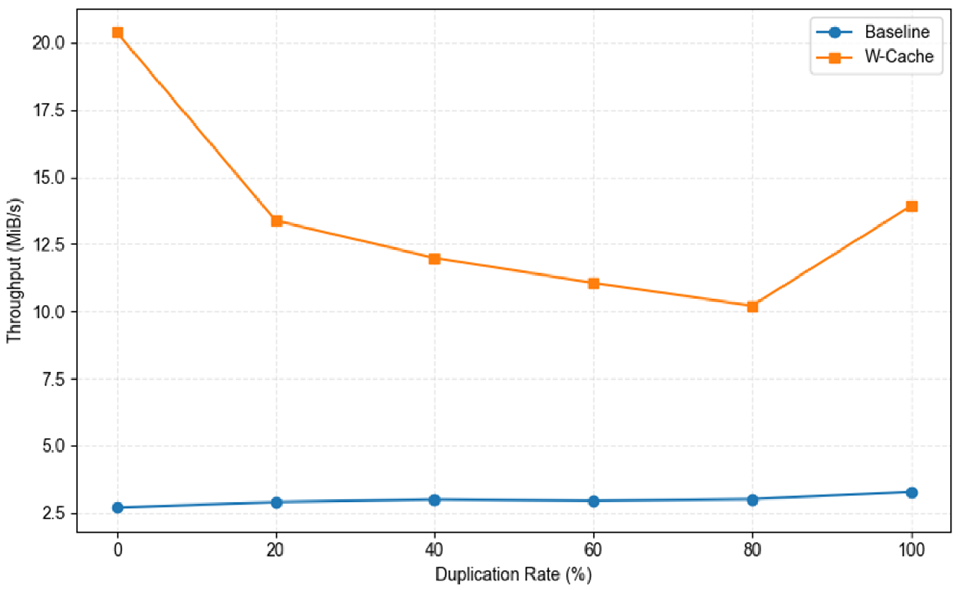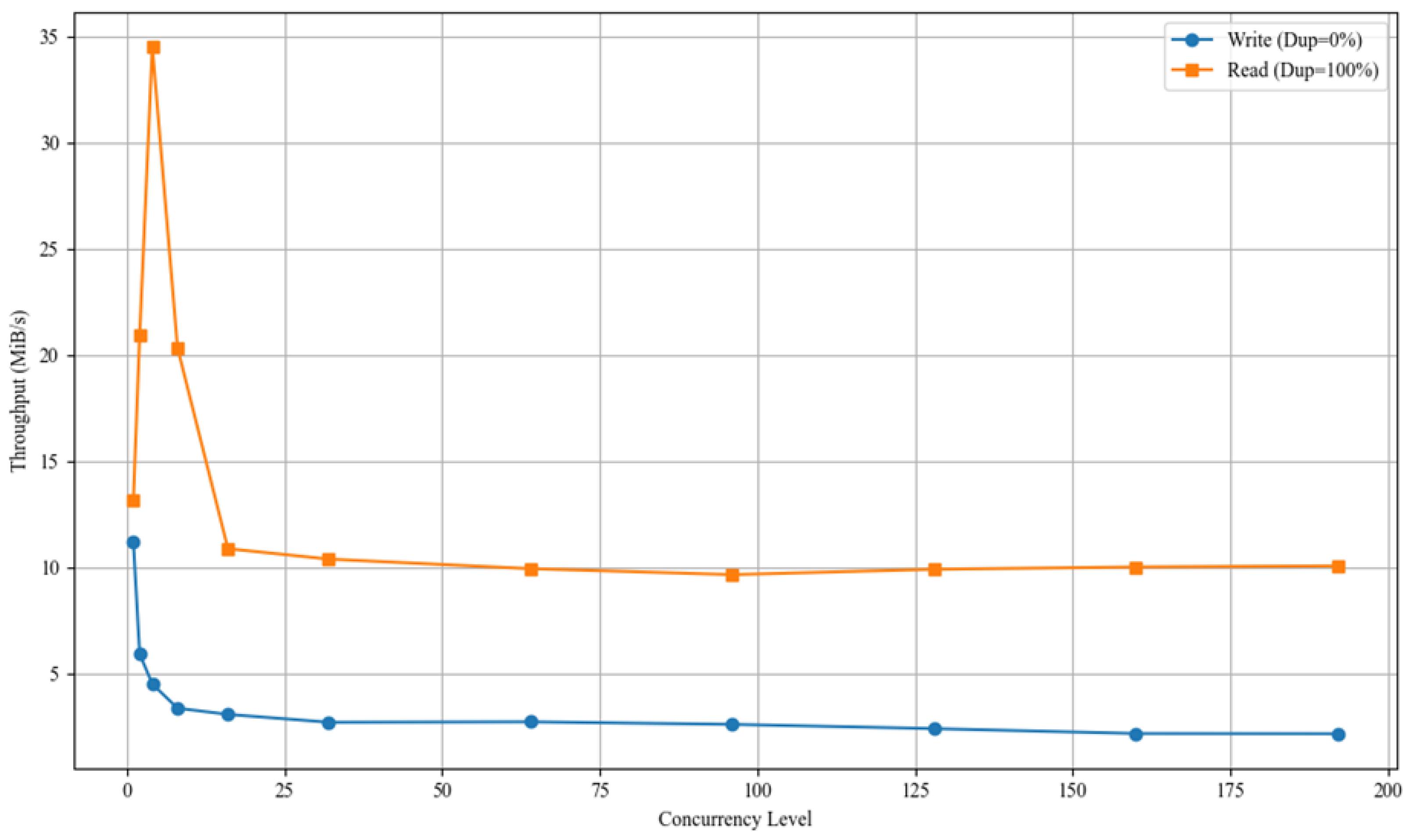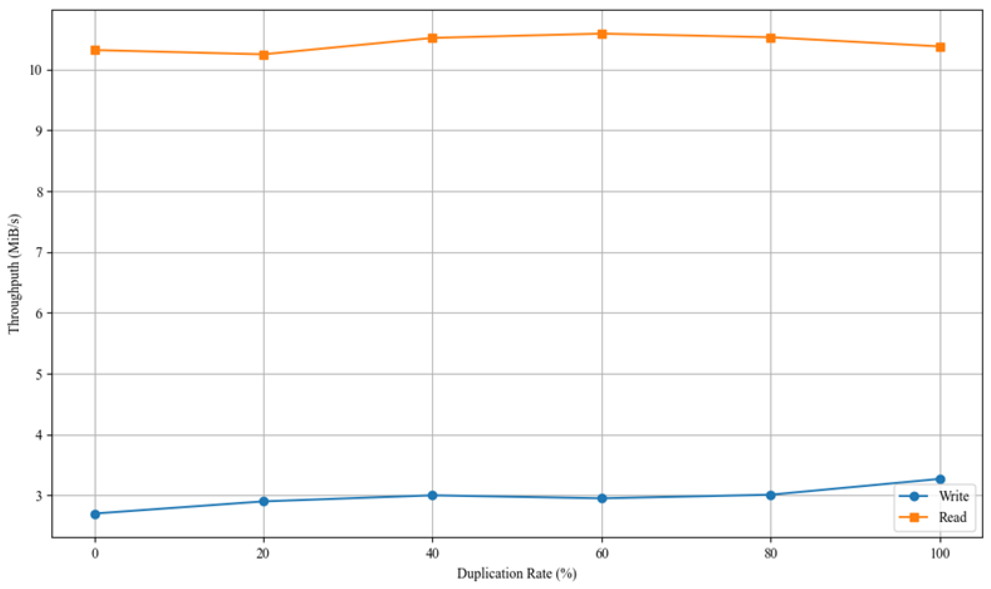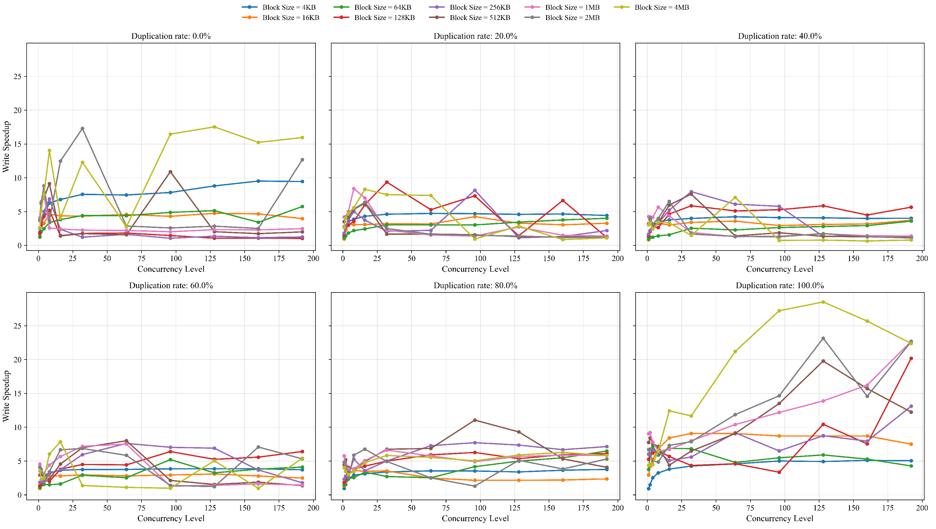 - Write Performance Comparison: In this experiment, the data deduplication ratio was set to 0%, and the operating system page cache was bypassed to ensure that the measurements accurately represented the inherent performance of the underlying write path.