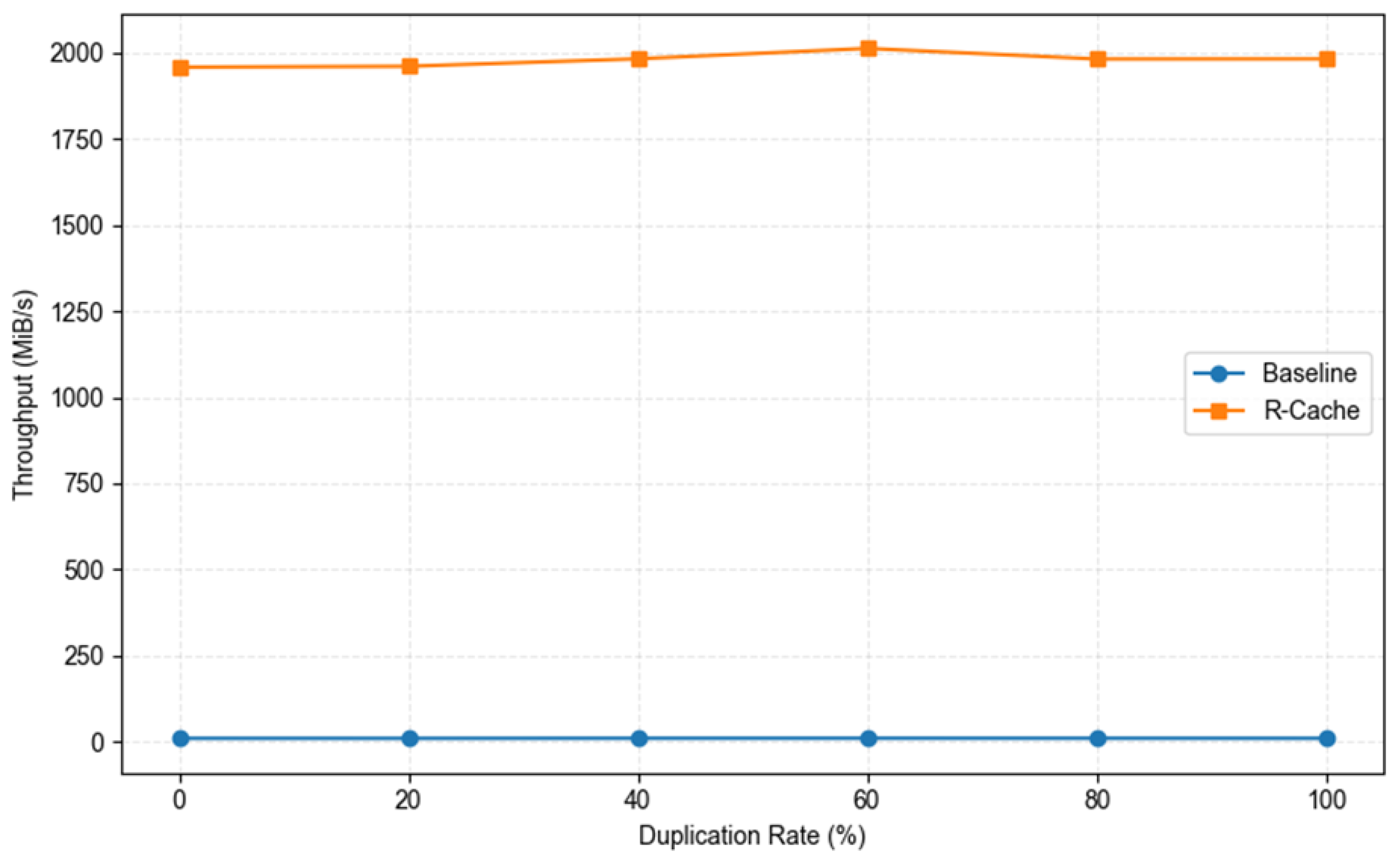 - Read Performance Comparison: We conducted comparative experiments to assess the performance gains of R-Cache under hotspot data access scenarios. To fully stimulate cache hit rates and highlight the advantages of the caching mechanism, all read tests were uniformly configured with a data duplication rate of 100%, simulating high-reuse hotspot access patterns to maximize the visibility of R-Cache’s optimization capability for random read performance.