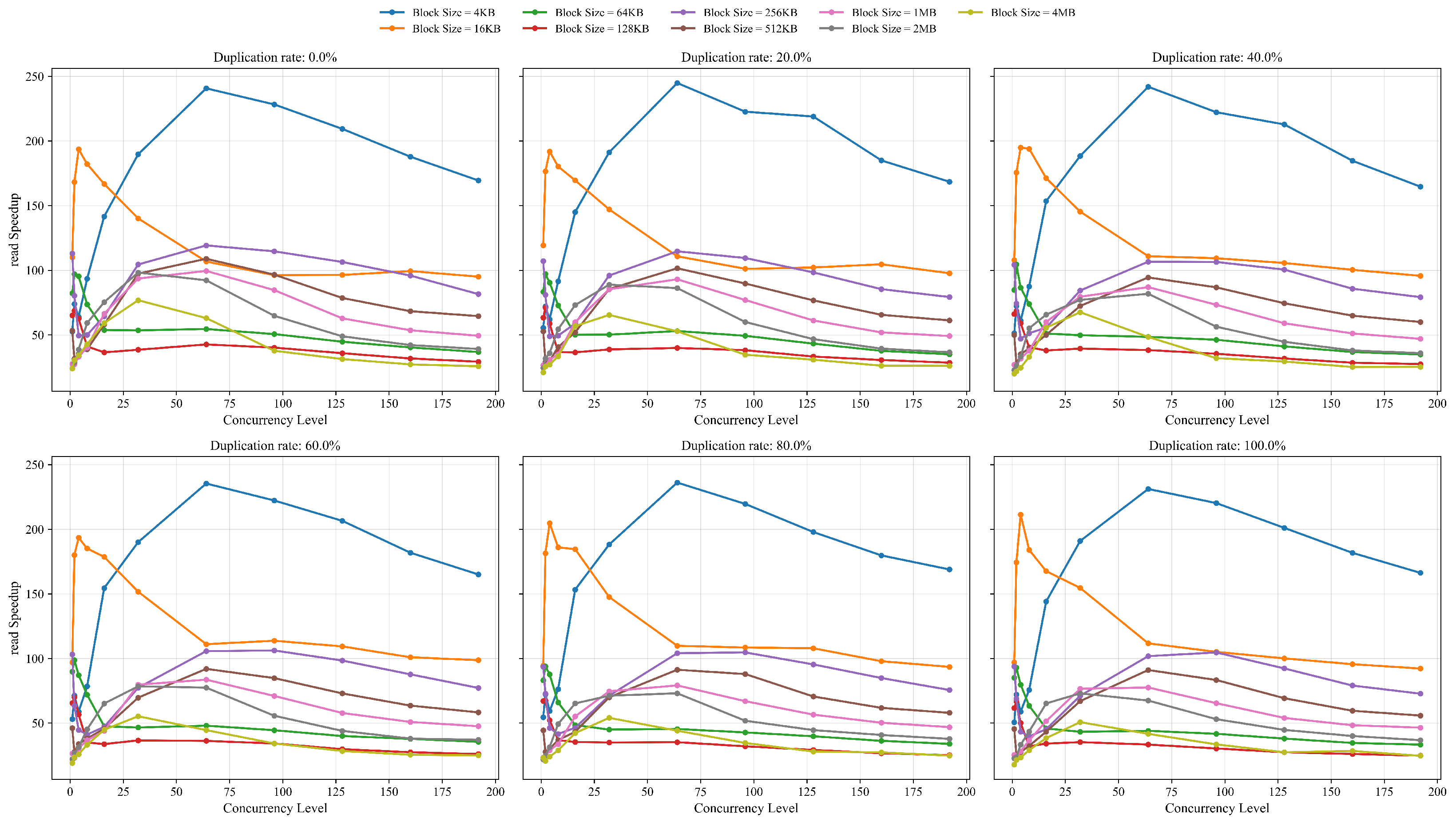 - We conduct a series of multidimensional experiments to systematically validate the proposed OCM approach, covering key aspects such as deduplication-aware write capability and the performance of caching mechanisms in both write and read paths. In the space saving evaluation, we use real-world mixed data for writing tests with varying duplication ratios to verify the effectiveness of OCM in recognizing redundant data and reducing physical storage consumption. In the performance assessment, we design test scenarios that vary duplication ratio, concurrency level, and block size, and evaluate OCM’s performance across workloads using metrics such as write throughput and read acceleration ratio. The experimental results demonstrate that the virtual disk constructed using the OCM method exhibits reliable availability in practical write scenarios and delivers stable I/O performance under highly concurrent read and write workloads.