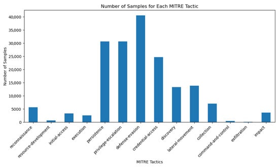 The processed dataset consists of three columns: CVE-ID, CVE-Description, and Tactics. For instance, CVE-2023-3519 is described as “Unauthenticated remote code execution” and involves four tactics: initial access, execution, privilege escalation, and lateral movement. After removing duplicates and invalid entries, the dataset contains 43,491 samples. However, the tactic exfiltration is entirely absent, while command and control and execution appear in only 9 and 95 samples, respectively, indicating a severe class imbalance.