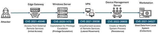 Figure 6 shows an example. Assume that an IIoT system includes an edge gateway, Windows server, VPN gateway, device management server, and workstations, and for each device there exists a CVE. The edge gateway involves CVE-2021-45046, which can be exploited for initial access, allowing attackers to execute malicious code on the device using designed HTTP requests to gain access. The Windows server has CVE-2020-1472, which allows attackers to bypass authentication and log in with administrative privileges. This CVE is related to the Privilidge Escalation tactic in the MITRE ATT&CK Tactics.