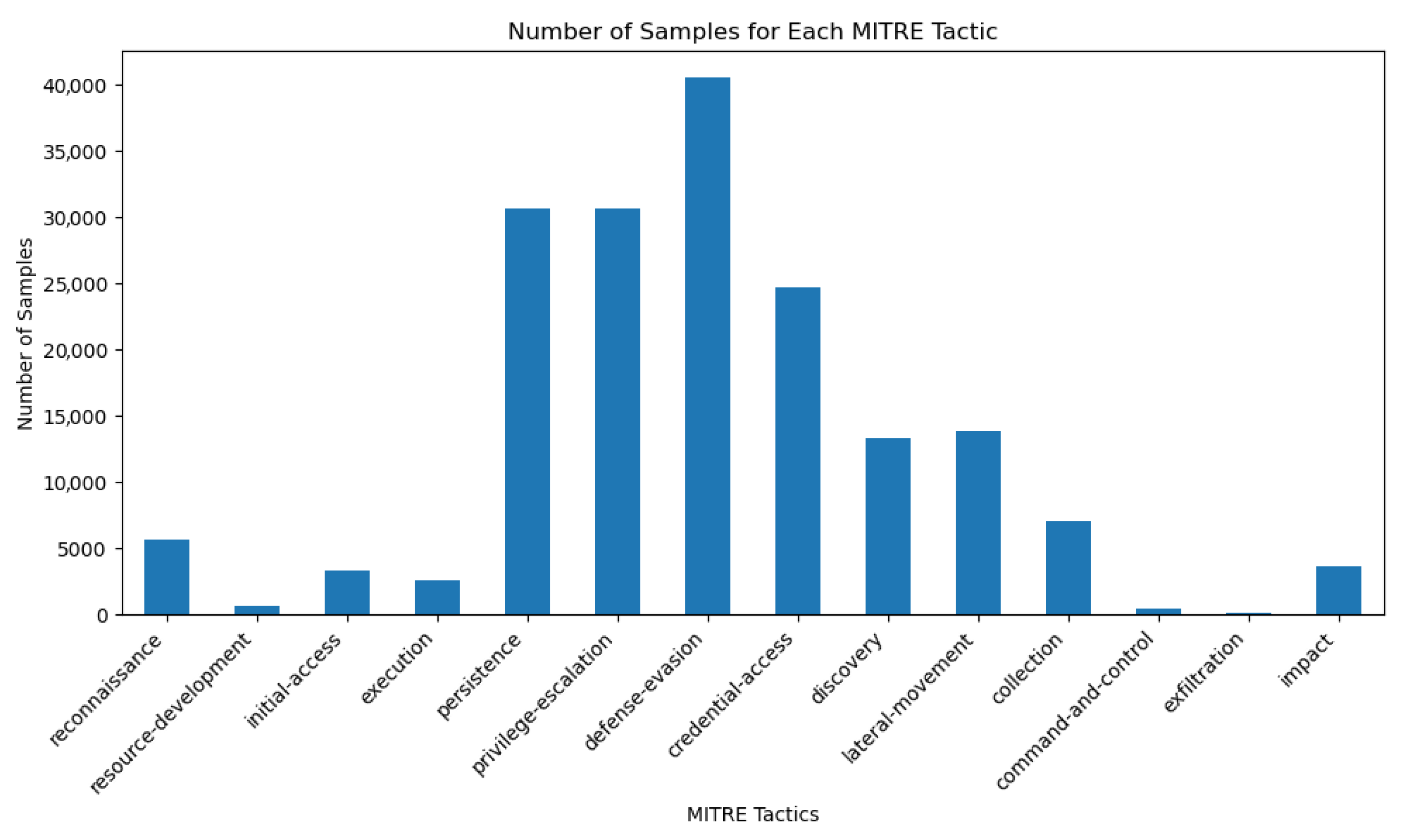 Figure 2 presents the distribution of CVEs mapped to different MITRE ATT&CK tactics. The tactics with the highest number of CVEs are credential access, privilege escalation, and defense evasion, each with around 30,000 to 40,000 samples. discovery and lateral movement also show significant numbers of samples, whereas tactics such as exfiltration, command and control, and resource development have relatively few associated CVEs.