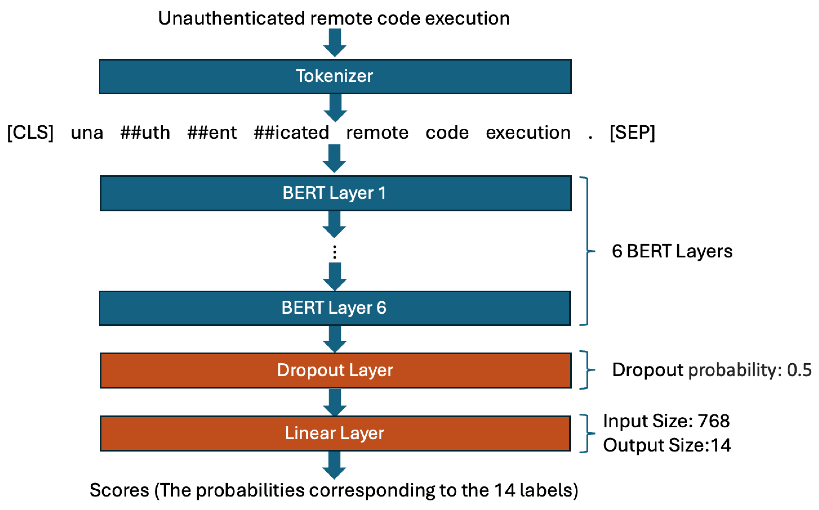 13]. Building on this idea, this paper creates a multilabel text classification model that accurately determines how a CVE might be exploited based on its description. The dataset was collected from the BRON database, which contains recent CVEs and records related to MITRE ATT&CK Tactics. The collected data was tokenized and processed using SecBERT [