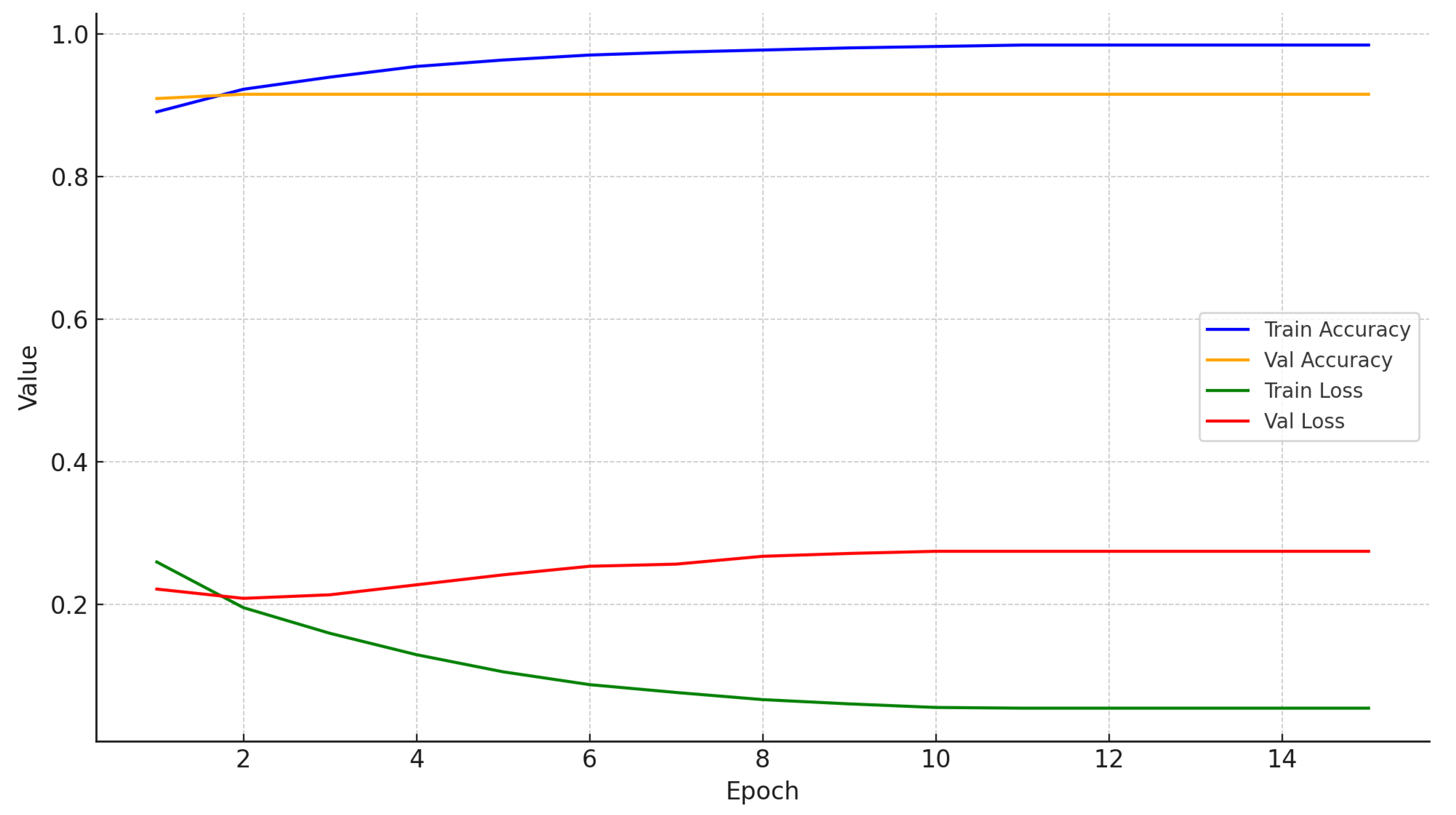Figure 7, the improved SecBERT model converged around 15 epochs, with training loss steadily decreasing, while validation loss initially dropped slightly but later increased and plateaued, suggesting potential overfitting.