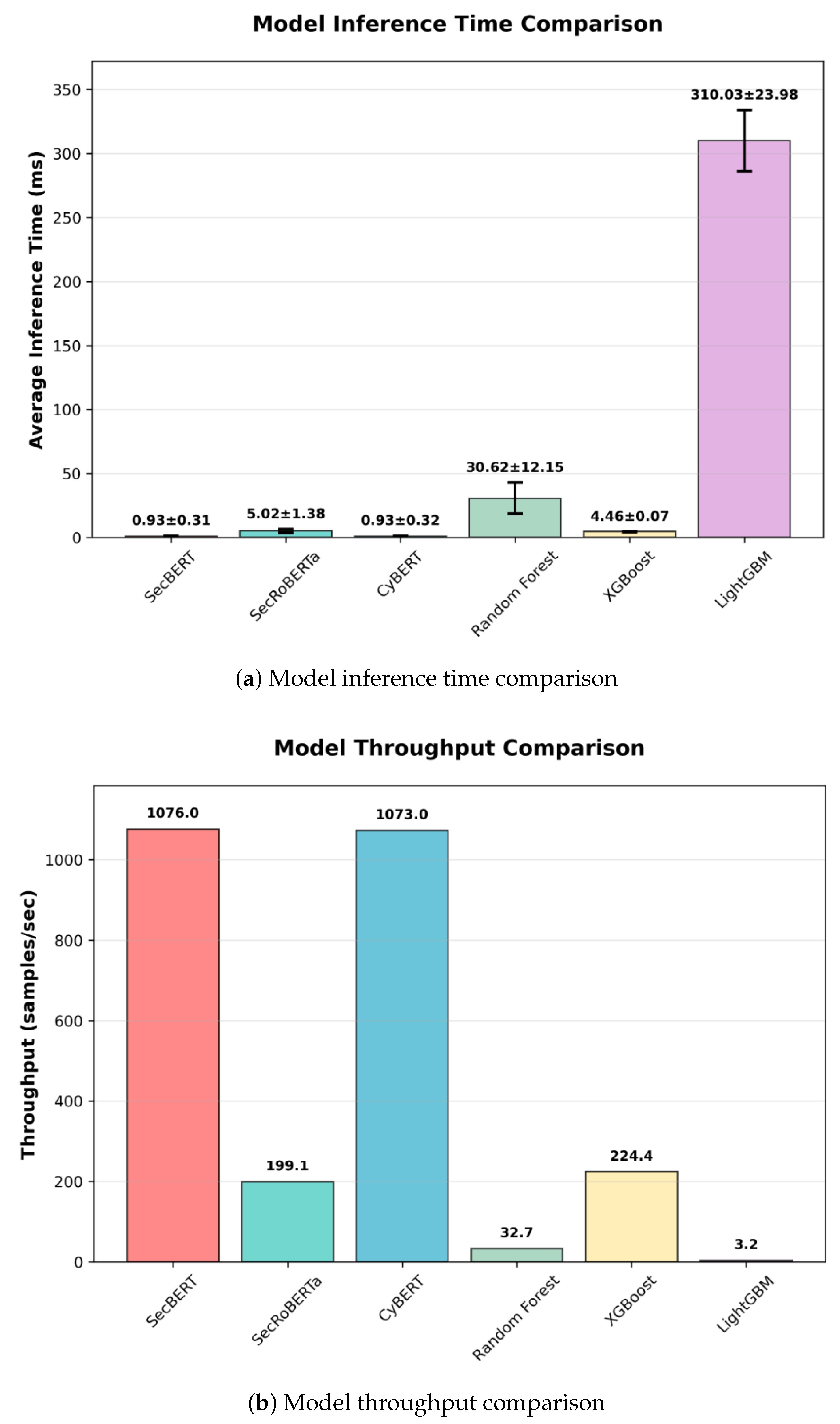 Figure 8 summarizes the inference latency and throughput of BERT-based models and traditional ML classifiers on the same hardware. The results show that SecBERT and CyBERT achieve the fastest inference, with an average latency of less than 1 ms per sample and throughput exceeding 1000 samples/s. SecRoBERTa is significantly slower, requiring on average 5 ms per sample (199 samples/s). Among the traditional classifiers, XGBoost demonstrates competitive efficiency with 4.46 ms latency and 224 samples/s throughput, while Random Forest is slower (30.62 ms, 32.66 samples/s) and LightGBM shows the poorest efficiency (310 ms latency, only 3.23 samples/s). Overall, BERT-based models not only achieve higher classification accuracy, but also deliver superior or comparable inference efficiency, with SecBERT offering the best balance between accuracy and deployment efficiency. Moreover, the SecBERT-based fine-tuned SecBERT model requires around 5 GB memory during training and around 1.2 GB during inference, with an on-disc model size of 457 MB. Compared with large language models, this footprint is substantially smaller, resulting in lower compute and memory pressure when deployed on IIoT servers or workstations.