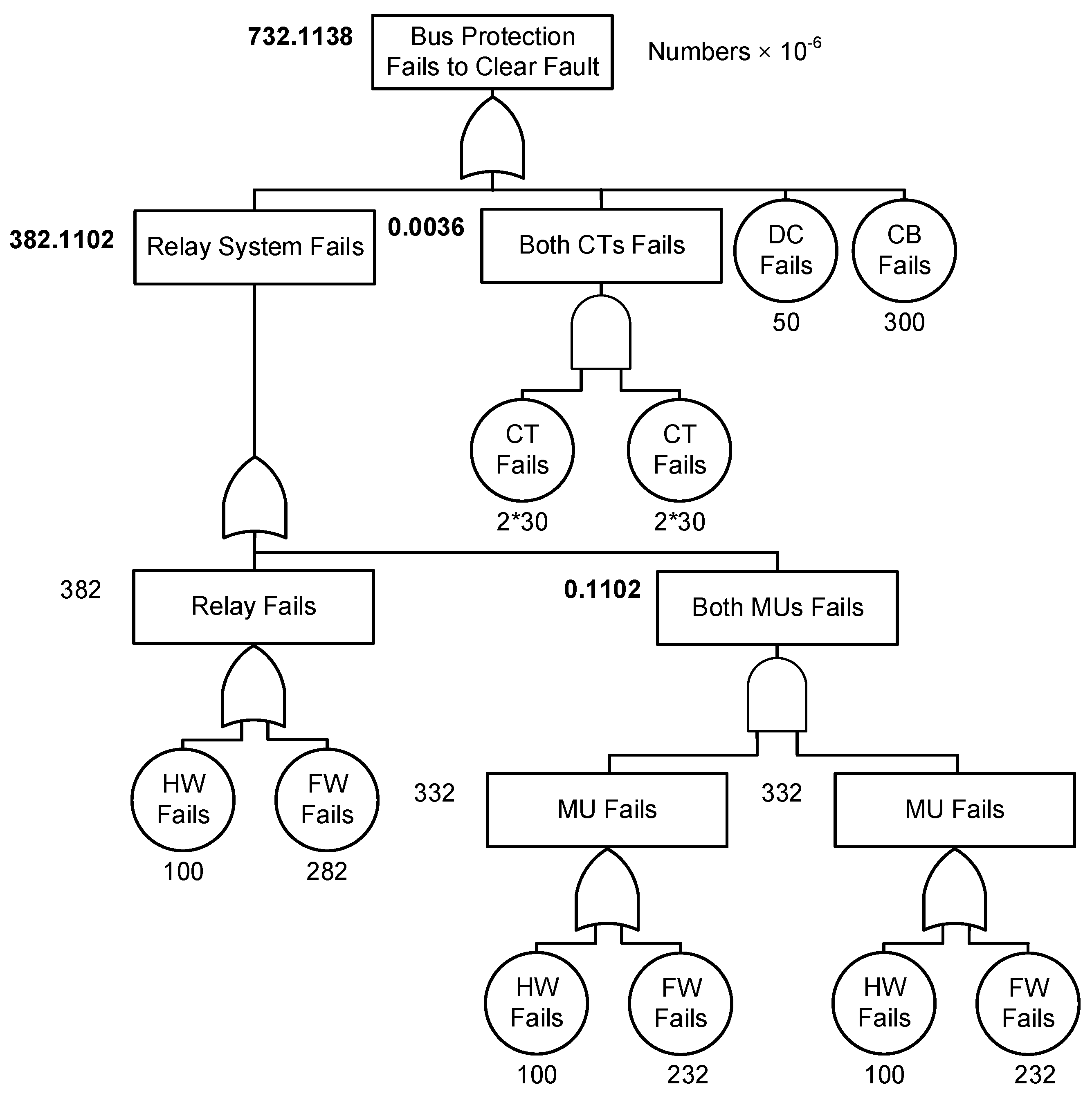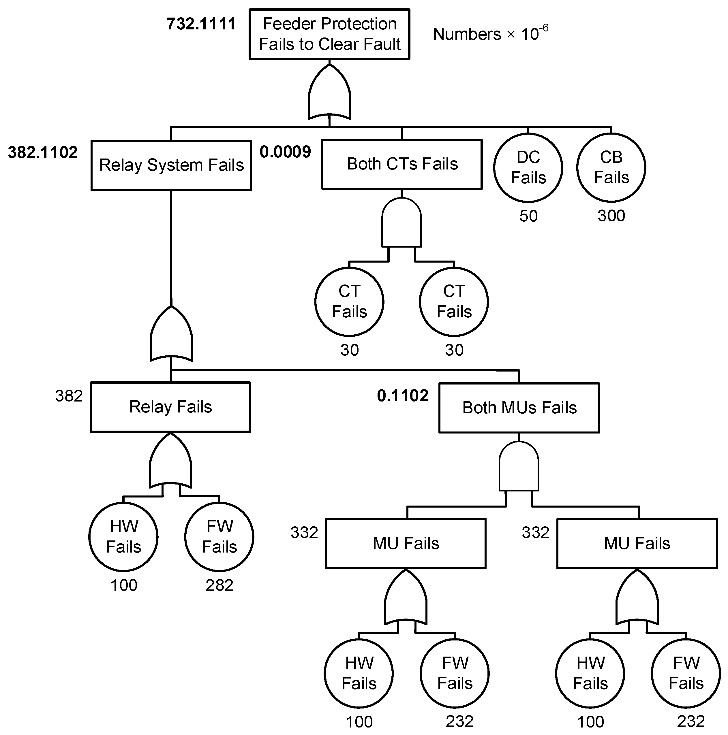 - Anderson, P.M.; Henville, C.; Rifaat, R.; Johnson, B.; Meliopoulos, S. (Eds.) Fault Tree Analysis of Protective Systems. In Power System Protection; Wiley: Hoboken, NJ, USA, 2022; pp. 1261–1310. [Google Scholar] [CrossRef]
