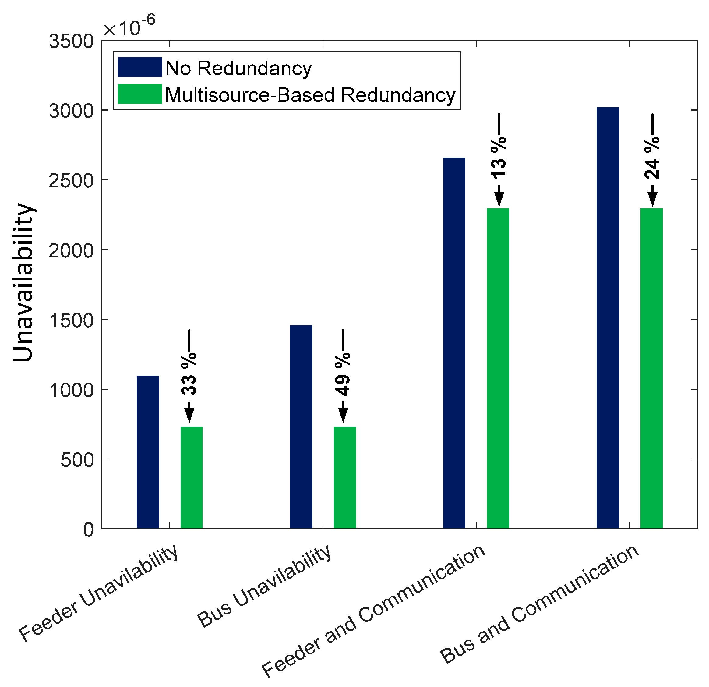 | System | No Redundancy Unavailability × 10−6 | Proposed Redundancy Unavailability × 10−6 | Unavailability Reduced by |