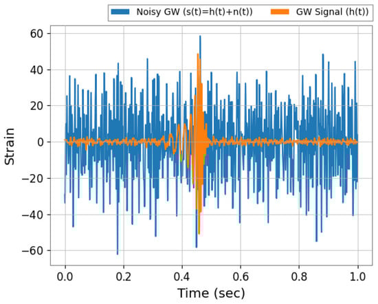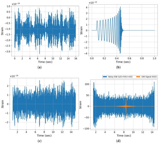 Figure 2a,b show the real noise segment obtained from LIGO and simulated gravitational GW signal, respectively. As seen from Figure 2a, real noise consists of random fluctuations caused by environmental and instrumental reasons. On the other hand, the GW waveform given in Figure 2b represents the expected signal from a BBH event. This signal is a short-duration, chirp-like waveform, characterized by an increasing frequency and amplitude over time, which is a signature feature of compact binary coalescence events. However, the short duration of the GW signal poses a challenge for its detection within long stretches of noisy data. On the other hand, Figure 2c,d demonstrate the noise after filtering and overlay the filtered and whitened noise with the simulated GW signal, respectively.