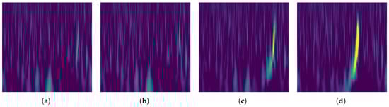 The effect of varying SNR values on the time–frequency representation of gravitational-wave signals can be seen in Figure 4. At low SNR, the signal is visually indistinguishable from background noise, as given in Figure 4a,b. However, as shown in Figure 4c,d, a chirp-like GW signal emerges and becomes clearly visible with increasing SNR values.