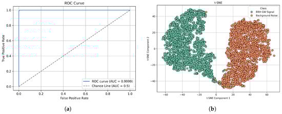 Figure 5 presents the ROC curve and t-SNE projection to illustrate the classification performance of the model. As shown in the figure, the proposed EDAT-BBH model demonstrates effective binary classification performance. The ROC curve given in Figure 5a shows an area under the curve (AUC) of 0.9998. Additionally, the t-SNE projection demonstrated in Figure 5b visualizes the learned high-dimensional representations. Separation between background noise and BBH signal using the EDAT-BBH model can be seen in Figure 5b.