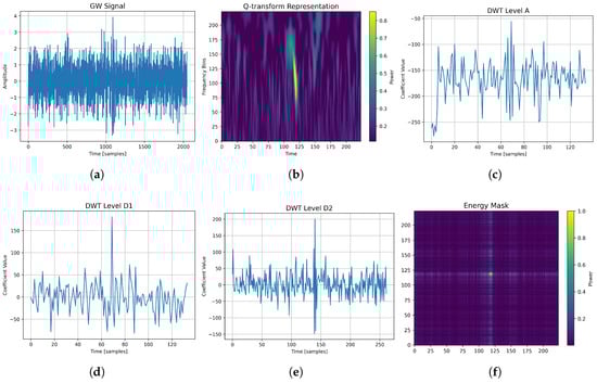 (a) A sample gravitational wave. (b) The Q-transform representation. (c–e) DWT levels A, D1, and D2, respectively, and (f) energy mask constructed from both Q-transform and DWT-based energy to modulate attention.