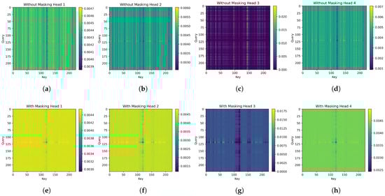Attention maps from the four heads of the Transformer (a–d) without masking (e–h) and employing energy-based mask.