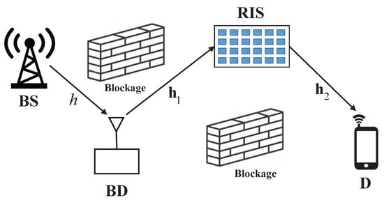 The growth of the Internet of Things (IoTs) has paved the way for ambient backscatter communication (AmBC) for spectral and energy efficiency. AmBC employs ambient radio frequency (RF) signals for low-power communication and leverages wireless signal modulation to enable cost-effective communication [1,2,3,4]. We employ a low-power multi-antenna design and a novel coding mechanism that can be decoded on backscatter devices (BDs), and these designs rely solely on energy harvested from television (TV) and solar sources [1]. In [2], a novel communication system that bridges RF-powered devices with the internet, i.e., Wi-Fi backscatter, is proposed. A communication system that enables two devices to communicate using only ambient RF as the source of power is presented in [3]. The performance of RF-powered cognitive radio networks (CRNs) with AmBC is investigated in [4]. Applications of AmBC include radio frequency identification (RFID) and electronic toll collection. Several challenges of AmBC technology include complex RF signals, transmission range, limited data rates, security concerns, and interference [5]. To enable technologies for next-generation mobile systems, reconfigurable intelligent surfaces (RISs) have emerged as promising solutions in both academia and industry [6]. An RIS consists of many passive and low-cost reflecting elements, each of which can independently reflect an electromagnetic wave with phase shifts [7]. Thus, RISs have recently received considerable interest on account of their enhanced energy efficiency and improved spectral efficiency [8,9,10,11,12]. An RIS for downlink multi-user communication from a multi-antenna base station is investigated in [8]. The authors of [9] introduced the emerging research field of RIS-empowered smart radio environments (SREs). A physics-based model and a scalable optimization framework for large IRSs were developed in [10]. The secrecy rate of an IRS-assisted Gaussian multiple-input–multiple-output (MIMO) wiretap channel (WTC) was enhanced in [11]. An IRS-aided multiple-input–single-output (MISO) wireless transmission system was investigated in [12]. The authors optimized the passive phase shift of each element at the IRS to maximize the downlink-received signal-to-noise ratio (SNR).