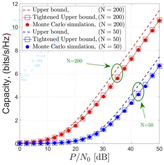 Figure 2 shows the ergodic capacity versus for different values of N. The upper bound of the conventional Jensen’s inequality is not tight for all the different values of N. However, the tightened upper bound is almost the same as the Monte Carlo simulation results for C. Thus, the tightness of in Theorem 1 is verified. In addition, the ergodic capacity intuitively increases with N.