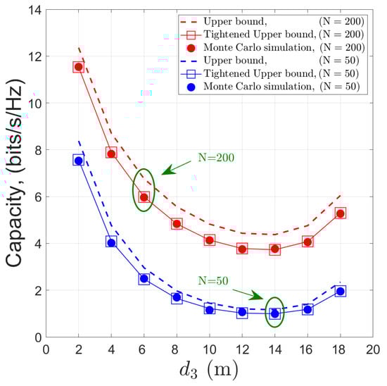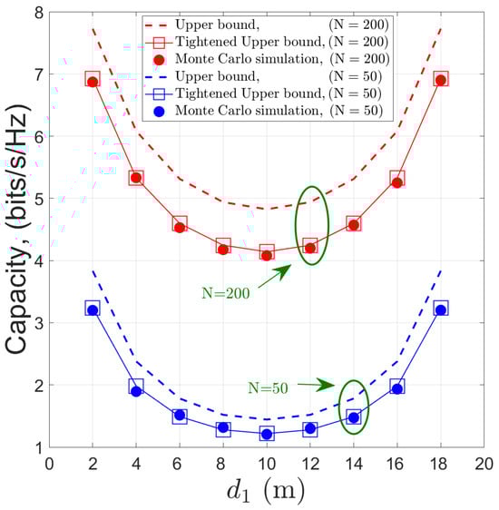 In this section, the simulation results are presented, and the analysis in the previous section is validated. A set of parameters is used to obtain the numerical results. In [18], an often-cited paper, N = 32, 64, and 256 is used. Therefore, we use similar numbers: N = 50, 200. The path loss exponents are given by . We set the Rician factor to . Unless otherwise specified, the distances are set to m.